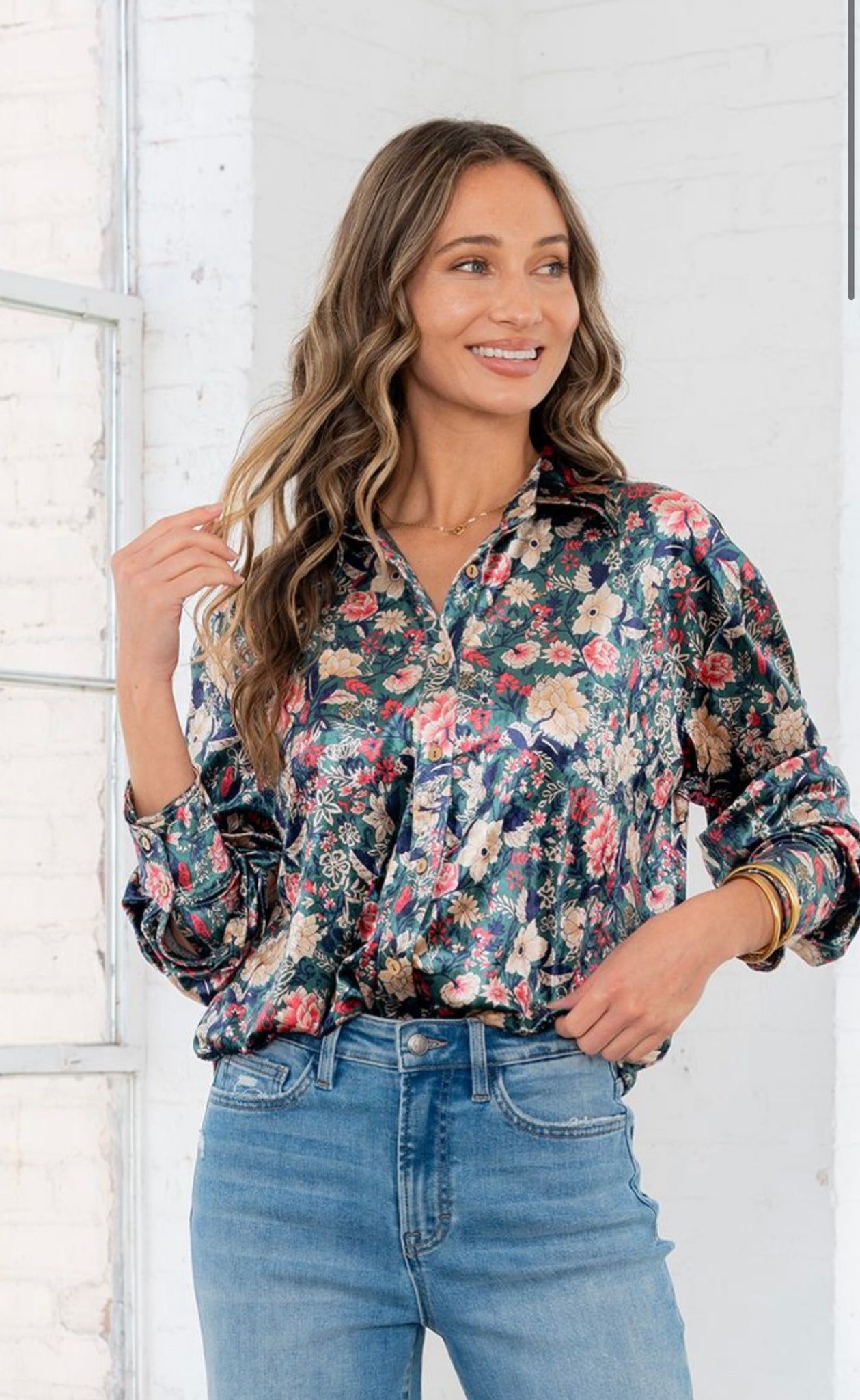 Holiday Floral Button Down Top with Greens and Reds is the perfect one for all your Holiday needs.