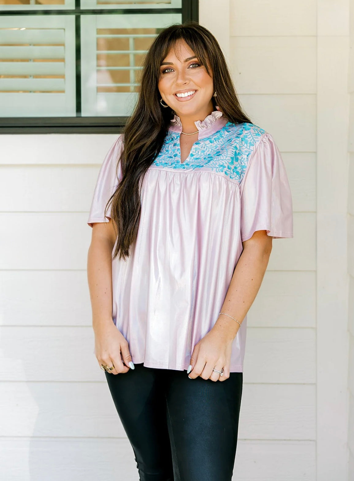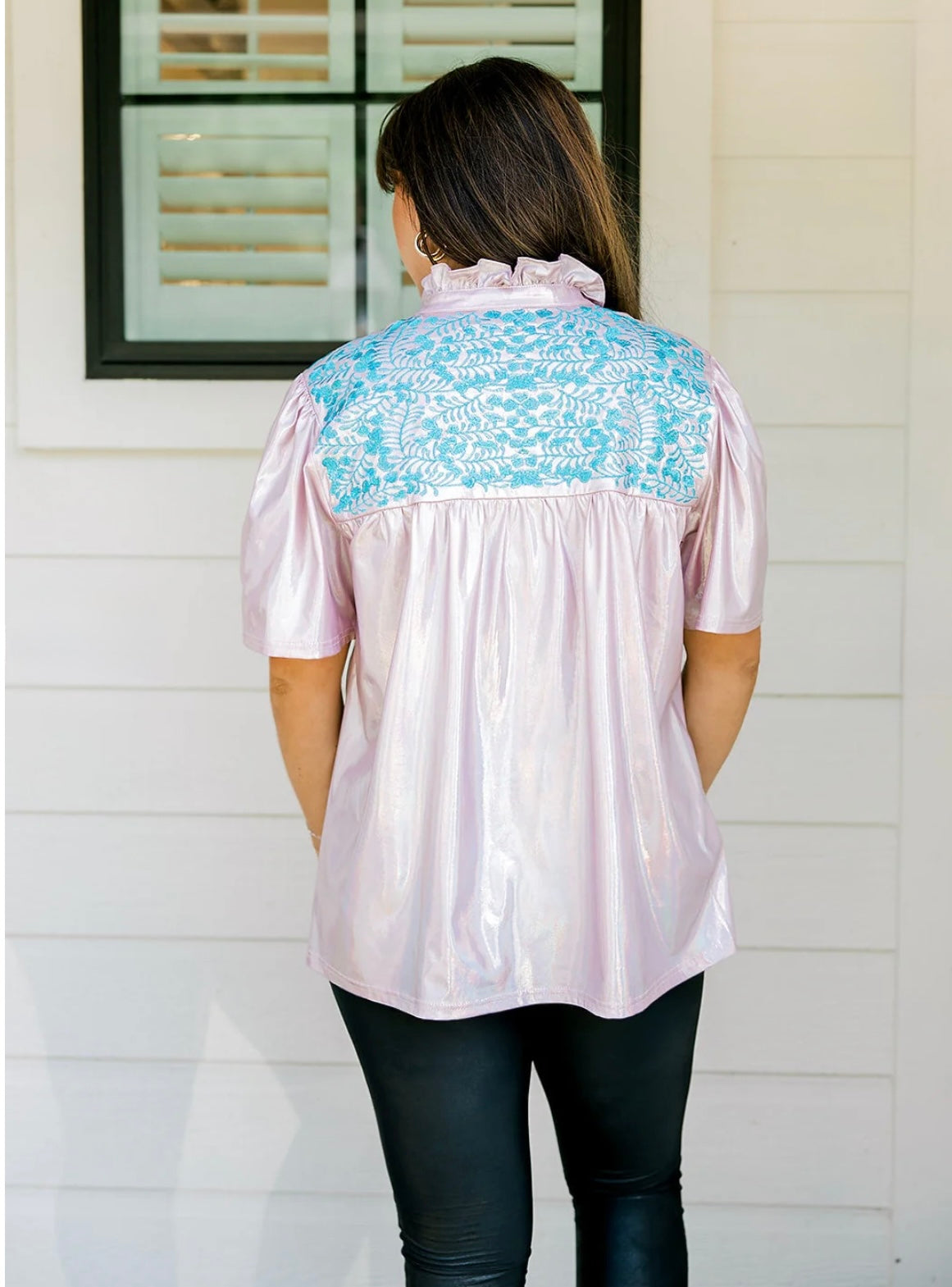 Accented with intricate turquoise embroidery, it blends ethereal elegance with bold, eye-catching detail for a truly unforgettable look. Turn heads in this stunning pink iridescent Reece-style bodysuit, designed with a sleek, form-fitting silhouette that shimmers with every movement.